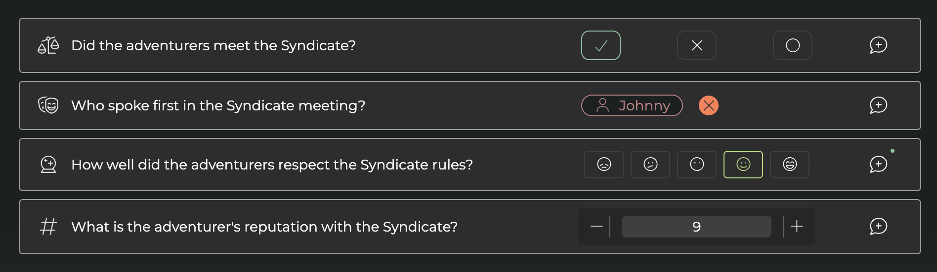 Roles answer the question “Who?” You can add multiple characters —usually player characters (PCs)—to the list. This makes it easy to assign actions performed by your players as the session unfolds.