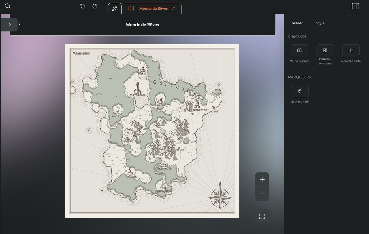 Saviez-vous que vous pouvez ajouter des cartes directement dans Lore ? Au sein de notre logiciel de worldbuilding , nous vous proposons également d’utiliser un système de pins pour placer les villes, les monuments et autres lieux importants !